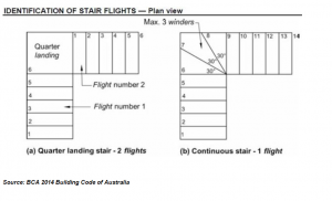 The BCA Code requirement for residential buildings is that a handrail needs to be continuous on each flight of stairs. The handrail does not need to be continuous on the landing between flights as long as there is a newel post. Winders refer to treads within a straight flight that are used to change direction of the stair. A continuous handrail is required on a winder, except in cases where there is a newel post installed to provide a handhold.